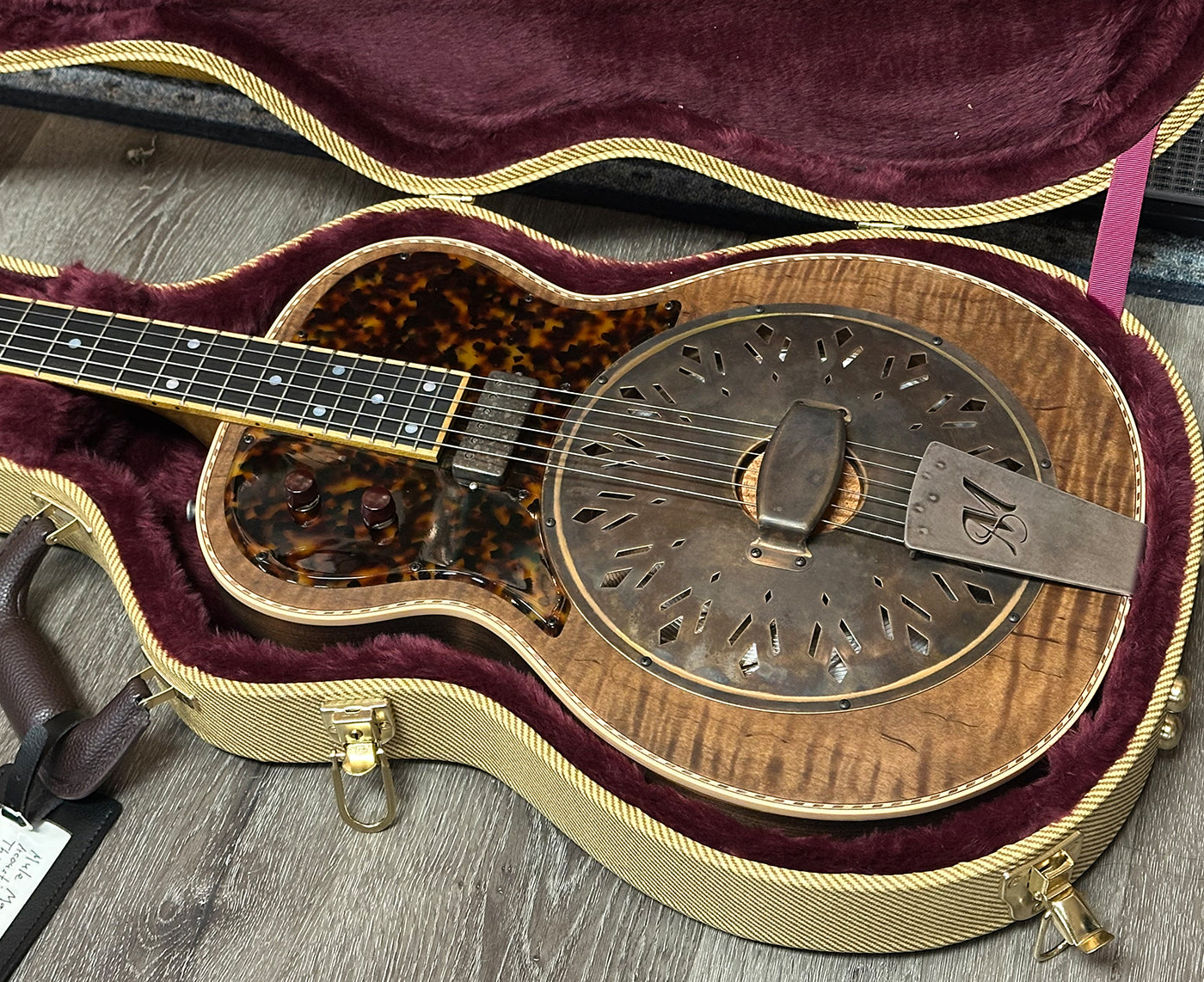 {"id":9151348900073,"title":"Mule Resophonic Mavis Thinline Resonator Guitar with Tweed Case","handle":"mule-resophonic-mavis-thinline-resonator-guitar-with-tweed-case","description":"\u003cp\u003eThe Mule Resophonic Mavis Guitar is a Thinline solid-body resonator guitar with a earthy, woody tone. Hailing from Saginaw, Michigan, luthier Matt Eich has crafted a special instrument that can be played with a slide for bluesy resonator vibes, fingerstyle for acoustic plunk, or ripping overdrive for rock tones. The 10\" resonator provides plenty of acoustic sustain and its signature tone. A 25\" scale length and 1 3\/4\" nut width, along with a deep \"C\" profile, feels great in the hand and delivers comfortable experience regardless of play style.\u003c\/p\u003e\n\u003cp\u003eThe double yellow tortoise pickguard, aged hardware, and satin finish screams vintage vibes, and the \u003cspan\u003eMule Tomthumbucker is voiced like a 0mini humbucker, giving a wide, woody sound that is uniquely its own. This used resonator is in mint condition, ready for the studio, gigs, or surprising folks at a jam. A surprisingly versatile guitar that sounds fantastic whatever situation you put it in. Includes a tweed hard shell case. \u003c\/span\u003e\u003cspan style=\"font-size: 0.875rem;\"\u003e \u003c\/span\u003e\u003cbr\u003e\u003c\/p\u003e\n\u003cp\u003e\u003cspan\u003e\u003cstrong\u003eCondition:\u003c\/strong\u003e Mint, sounds amazing. Instant mojo!\u003c\/span\u003e\u003c\/p\u003e\n\u003cp\u003e\u003cb\u003eFeatures\u003c\/b\u003e\u003c\/p\u003e\n\u003cul\u003e\n\u003cli\u003e\n\u003cp\u003e\u003cb\u003eInstrument:\u003c\/b\u003e Resonator\u003c\/p\u003e\n\u003c\/li\u003e\n\u003cli\u003e\n\u003cp\u003e\u003cb\u003eBrand:\u003c\/b\u003e Mule Resophonic Guitars\u003c\/p\u003e\n\u003c\/li\u003e\n\u003cli\u003e\n\u003cp\u003e\u003cb\u003eModel:\u003c\/b\u003e Mavis Thinline Electric\u003c\/p\u003e\n\u003c\/li\u003e\n\u003cli\u003e\n\u003cp\u003e\u003cb\u003eFinish:\u003c\/b\u003e Satin\u003c\/p\u003e\n\u003c\/li\u003e\n\u003cli\u003e\n\u003cp\u003e\u003cb\u003eBody Material:\u003c\/b\u003e Tri Cone Steel\u003c\/p\u003e\n\u003c\/li\u003e\n\u003cli\u003e\n\u003cp\u003e\u003cb\u003eFinish Material:\u003c\/b\u003e Medium-Heavy Patina\u003c\/p\u003e\n\u003c\/li\u003e\n\u003cli\u003e\n\u003cp\u003e\u003cb\u003eNeck\/Fingerboard:\u003c\/b\u003e Maple\/Ebony\u003c\/p\u003e\n\u003c\/li\u003e\n\u003cli\u003e\n\u003cp\u003e\u003cb\u003eRadius:\u003c\/b\u003e 20\"\u003c\/p\u003e\n\u003c\/li\u003e\n\u003cli\u003e\n\u003cp\u003e\u003cb\u003eScale Length:\u003c\/b\u003e 25.25\"\u003c\/p\u003e\n\u003c\/li\u003e\n\u003cli\u003e\n\u003cp\u003e\u003cb\u003eNut Width:\u003c\/b\u003e 1.83\"\u003c\/p\u003e\n\u003c\/li\u003e\n\u003cli\u003e\n\u003cp\u003e\u003cb\u003eNeck Profile:\u003c\/b\u003e Soft V\u003c\/p\u003e\n\u003c\/li\u003e\n\u003cli\u003e\n\u003cp\u003e\u003cb\u003eNeck Thickness:\u003c\/b\u003e .88\"- 2.93\"(at heel)\u003c\/p\u003e\n\u003c\/li\u003e\n\u003cli\u003e\n\u003cp\u003e\u003cb\u003eElectronics:\u003c\/b\u003e Mule Minihumbucker Original Electronics\u003c\/p\u003e\n\u003c\/li\u003e\n\u003cli\u003e\n\u003cp\u003e\u003cb\u003ePickup Impedance:\u003c\/b\u003e 5.71K\u003c\/p\u003e\n\u003c\/li\u003e\n\u003cli\u003e\n\u003cp\u003e\u003cb\u003eCase:\u003c\/b\u003e OHSC Tweed Case\u003c\/p\u003e\n\u003c\/li\u003e\n\u003c\/ul\u003e\n\u003cul\u003e\u003c\/ul\u003e","published_at":"2025-12-12T00:59:34-05:00","created_at":"2025-12-12T00:50:58-05:00","vendor":"Mule","type":"Resonator","tags":["Blues Guitar","Boutique Resonator Guitars","Folk Instruments","Mule Mavis Resonator","Mule Resonator","Resonator","Slide Guitar","Thinline Resonator","Tri-Cone"],"price":389500,"price_min":389500,"price_max":389500,"available":true,"price_varies":false,"compare_at_price":null,"compare_at_price_min":0,"compare_at_price_max":0,"compare_at_price_varies":false,"variants":[{"id":49927760969961,"title":"Default Title","option1":"Default Title","option2":null,"option3":null,"sku":"MULE-RESO-Mavis-TL","requires_shipping":true,"taxable":true,"featured_image":null,"available":true,"name":"Mule Resophonic Mavis Thinline Resonator Guitar with Tweed Case","public_title":null,"options":["Default Title"],"price":389500,"weight":11793,"compare_at_price":null,"inventory_quantity":1,"inventory_management":"shopify","inventory_policy":"deny","barcode":null,"requires_selling_plan":false,"selling_plan_allocations":[]}],"images":["\/\/megatonemusic.com\/cdn\/shop\/files\/Mule-Mavis-Thinline-Resonator-Electric-Guitar-Image-1.jpg?v=1765518797","\/\/megatonemusic.com\/cdn\/shop\/files\/Mule-Mavis-Thinline-Resonator-Electric-Guitar-Image-2.jpg?v=1765518798","\/\/megatonemusic.com\/cdn\/shop\/files\/Mule-Mavis-Thinline-Resonator-Electric-Guitar-Image-3.jpg?v=1765518798","\/\/megatonemusic.com\/cdn\/shop\/files\/Mule-Mavis-Thinline-Resonator-Electric-Guitar-Image-4.jpg?v=1765518798","\/\/megatonemusic.com\/cdn\/shop\/files\/Mule-Mavis-Thinline-Resonator-Electric-Guitar-Image-5.jpg?v=1765518798","\/\/megatonemusic.com\/cdn\/shop\/files\/Mule-Mavis-Thinline-Resonator-Electric-Guitar-Image-6.jpg?v=1765518798","\/\/megatonemusic.com\/cdn\/shop\/files\/Mule-Mavis-Thinline-Resonator-Electric-Guitar-Image-7.jpg?v=1765518798","\/\/megatonemusic.com\/cdn\/shop\/files\/Mule-Mavis-Thinline-Resonator-Electric-Guitar-Image-8.jpg?v=1765518798","\/\/megatonemusic.com\/cdn\/shop\/files\/Mule-Mavis-Thinline-Resonator-Electric-Guitar-Image-9.jpg?v=1765518798","\/\/megatonemusic.com\/cdn\/shop\/files\/Mule-Mavis-Thinline-Resonator-Electric-Guitar-Image-10.jpg?v=1765518798","\/\/megatonemusic.com\/cdn\/shop\/files\/Mule-Mavis-Thinline-Resonator-Electric-Guitar-Image-11.jpg?v=1765518798","\/\/megatonemusic.com\/cdn\/shop\/files\/Mule-Mavis-Thinline-Resonator-Electric-Guitar-Image-12.jpg?v=1765518798","\/\/megatonemusic.com\/cdn\/shop\/files\/Mule-Mavis-Thinline-Resonator-Electric-Guitar-Image-13.jpg?v=1765518798","\/\/megatonemusic.com\/cdn\/shop\/files\/Mule-Mavis-Thinline-Resona